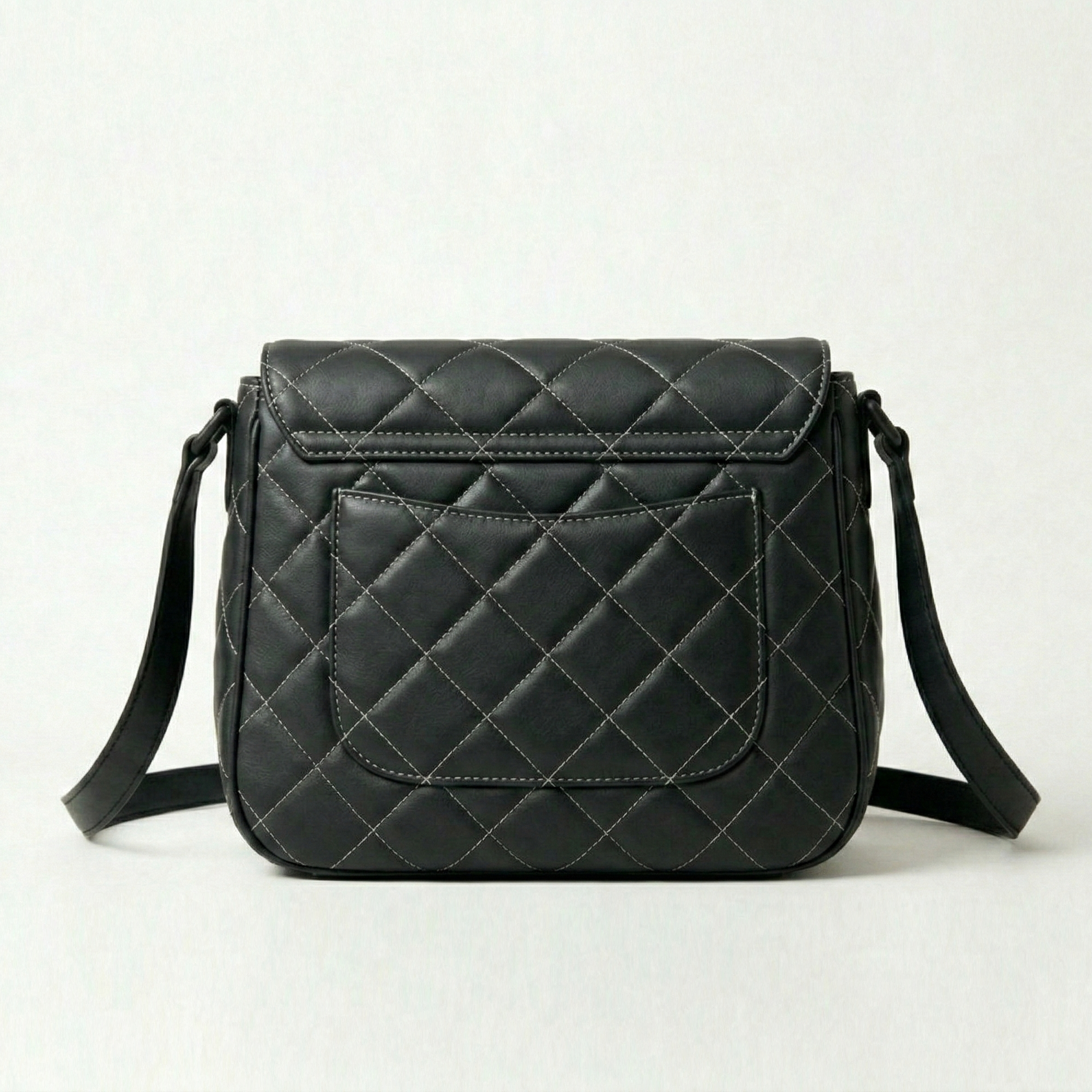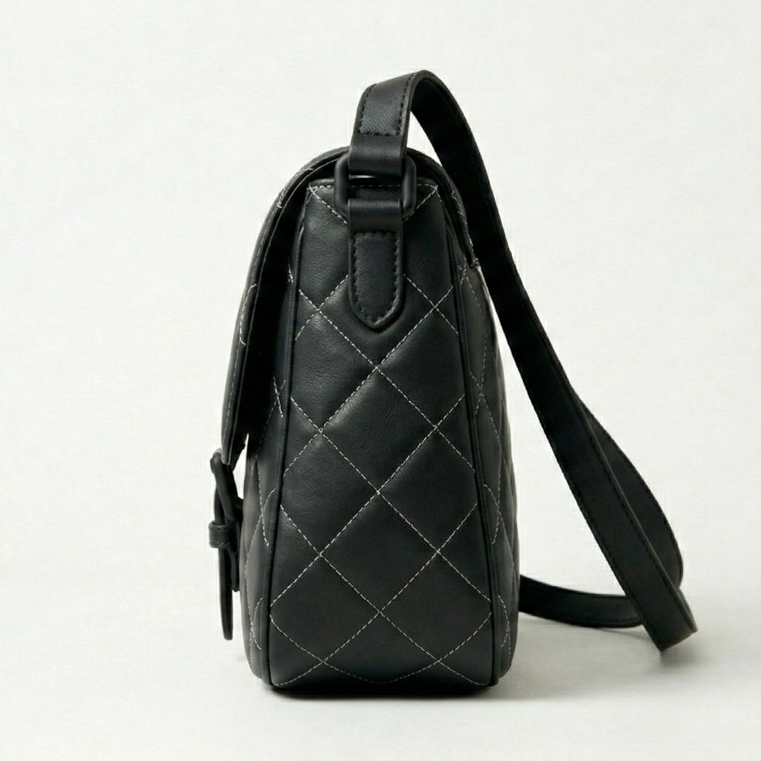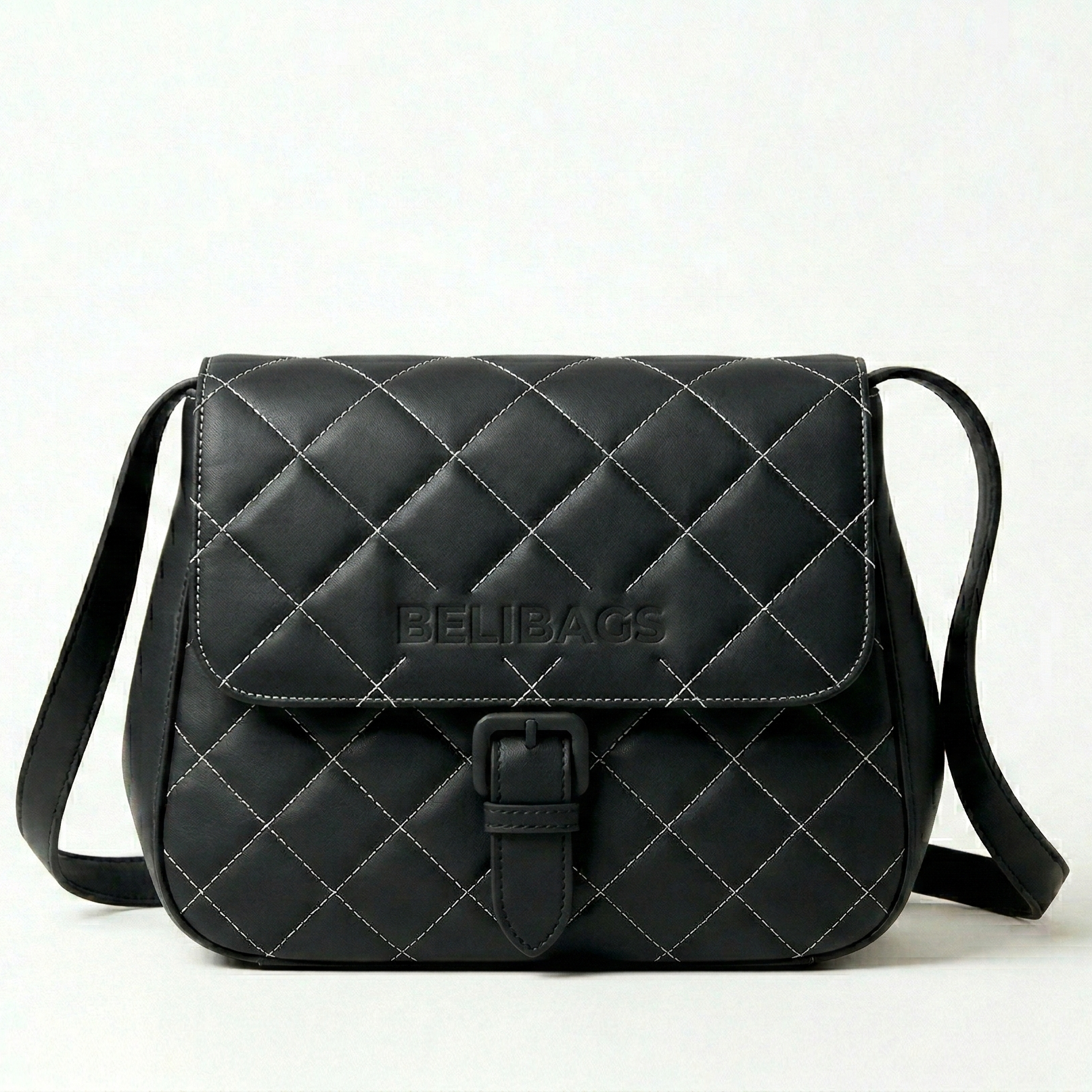 The Belibags Quilted Black Leather Crossbody Bag features a modern quilted pattern with contrasting stitching and a flap closure accented by a buckle detail. Made from smooth leather, it offers a comfortable adjustable strap and a compact interior for daily essentials. A versatile choice for both casual and formal occasions.